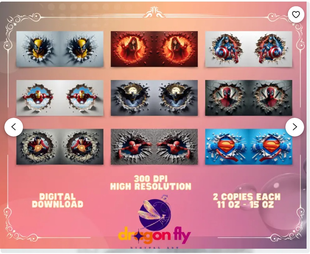 Transforma cualquier taza en una obra de arte épica con nuestras envolturas 3D de superhéroes y personajes de películas. Cada diseño está elaborado con calidad 300 DPI, en alta resolución, listo para sublimación en tazas de 11 oz y 15 oz. Perfecto para regalar, vender o simplemente disfrutar de tu bebida favorita con tus héroes favoritos.